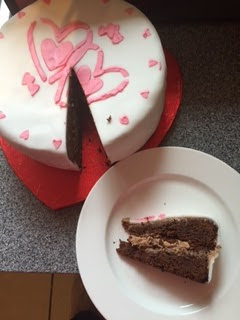 And finally placed the cake on a heart-shaped cake board I already had. My fiancé thought it was cute and thought the chocolate cake was particularly good.