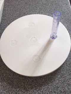 To start with, you decide if you want your floating element off to one side or in the middle, and screw the base rod into the appropriate hole and cover the other holes with blanking plates. Place the cake over the rod so it goes through the cake - it worked fine but it would probably have been more sensible to do this before I filled the cake, ie put one layer of cake over the rod, then spread over the filling and put the other cake on top, rather than put the entire cake over the rod!