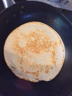 I used 150g buckwheat flour to 250ml milk and one egg to make four pancakes; whisk the egg and milk together and make a well in the flour, and pour in, whisking well. Heat a little oil or butter or coconut oil in a frying pan, pour in enough mixture to just cover the base of the pan and cook until browned on both sides. My husband had his filled with grated cheese, while I spread mine with goat's cheese (I had a bit left over in the fridge from another recipe) and smoked salmon. Delicious!