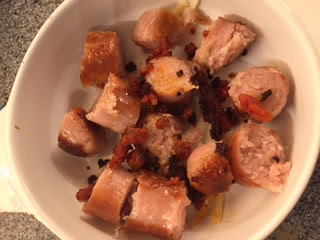 Preheat the oven to 180C. First fry or grill a couple of sausages per person until they are just cooked and cut into chunks. You can also add some diced chorizo or pancetta to the pan and fry. Put into a pie dish (either an individual dish or a large one - I did an individual one for my husband) and pour over half a tin of baked beans and mix together.