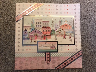 I then added the main topper, a silver foil-edged picture of a snowy street, and mounted the small topper with the sentiment overlapping slightly. I cut a piece of border - on another sheet of card provided - into three sections: two to go diagonally over the corners of the card and one to come down from underneath the sentiment. The pieces are all glued flat but this card would also look good if you used adhesive pads to raise some of the elements off the card.