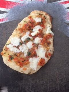 The tutor had already made the pizza dough and demonstrated what to do; we then took it in turns rolling out a piece of dough, topping it with chopped tomatoes and mozzarella, and using a wooden paddle to place it on top of a pizza stone on the barbecue. You can find a